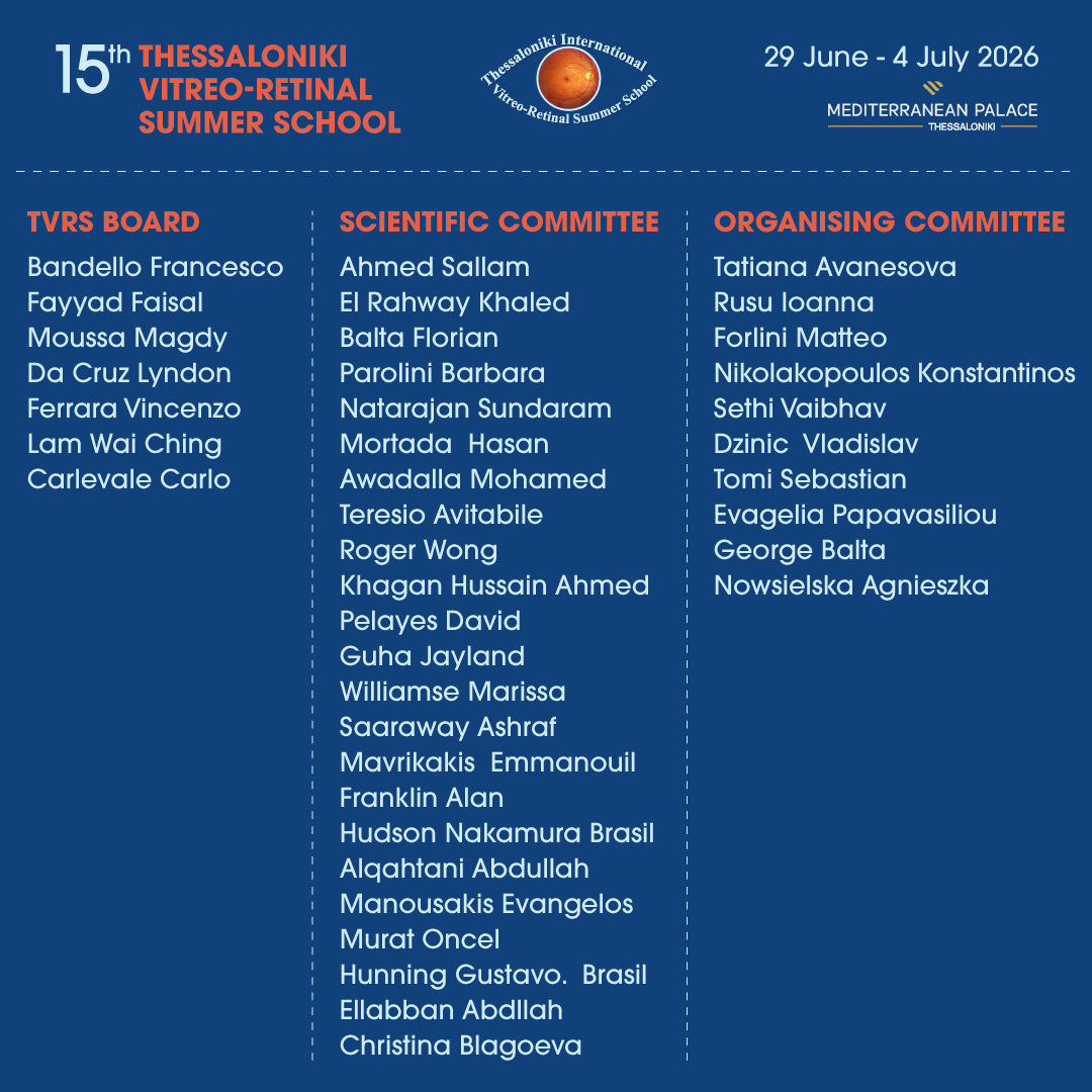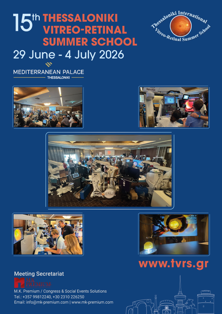 We have the honour to invite you to the 15th THESSALONIKI VITREORETINAL SUMMER SCHOOL (TVRS), which this year, is going to be held in 29th of June – 4th of July, 2026 in Thessaloniki.